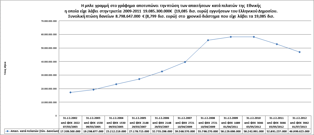 Ζημιά για την οποία εκ νέου επιβαρύνθηκαν οι Έλληνες Πολίτες για ακόμη μία φορά μέσω της εκ νέου αύξησης του δανεισμού της Χώρας με δέκα εννιά δισεκατομμύρια εκατόν εβδομήντα πέντε εκατομμύρια εννιακόσιες εβδομήντα χιλιάδες ευρώ (19.175.970.000,00€) όπως καταγράφεται στο πίνακα Β (κατηγορίες χρέους Κεντρικής Διοίκησης) του δελτίου δημοσίου χρέους ν.70 (Ιούνιος 2013) από τα οποία προήλθε η νέα αύξηση των επτά δισεκατομμυρίων διακοσίων εκατομμυρίων ευρώ (7.200.000.000,00€) του κεφαλαίου του ΤΧΣ.