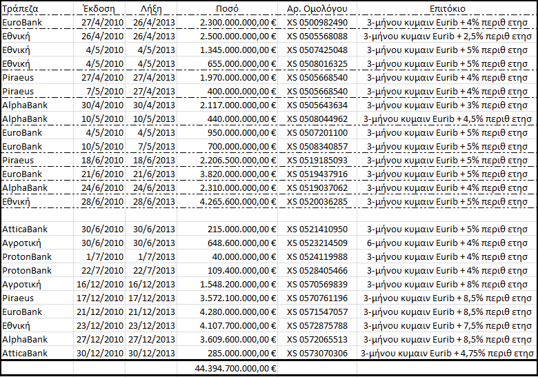 Δηλαδή η αδυναμία των τραπεζών να αποπληρώσουν τις υποχρεώσεις τους προς την Ευρωπαϊκή Κεντρική Τράπεζα επιβαρύνει το Ελληνικό Δημόσιο με επιπλέον τόκους αφού είναι βέβαιο για οποιοδήποτε νοήμωνα Πολίτη ότι είναι αδύνατον τα πιστωτικά ιδρύματα στο σύνολο τους να αποπληρώσουν τα δυσθεώρητα ποσά εγγυήσεων που έχουν λάβει όταν μάλιστα αυτά επιβαρύνονται από την «αλληλέγγυα» Ευρωπαϊκή Κεντρική Τράπεζα με αύξηση του ετήσιου περιθωρίου του επιτοκίου της κατά 12% μέσο όρο. Με δεδομένη τη διαρκή οικονομική αδυναμία των τραπεζών προκύπτει το ασφαλές συμπέρασμα ότι αντικαταστάθηκαν και τα ομόλογα του Ελληνικού Δημοσίου που έληγαν στο δεύτερο εξάμηνο του 2013 συνολικού ύψους δέκα οκτώ δισεκατομμυρίων τετρακοσίων δέκα πέντε εκατομμυρίων εξακοσίων χιλιάδων ευρώ (18.415.600.000,00€).