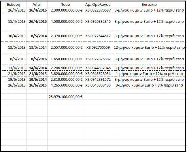 Τα ομόλογα αυτά προκειμένου να αποφευχθεί η περαιτέρω αύξηση του Δημοσίου Χρέους κατά είκοσι πέντε δισεκατομμύρια εννιακόσια εβδομήντα εννιά εκατομμύρια εκατό χιλιάδες ευρώ (25.979.100.000,00€) αντικαταστάθηκαν με άλλα ισόποσης αξίας και μεταγενέστερης λήξης (2014-2016).