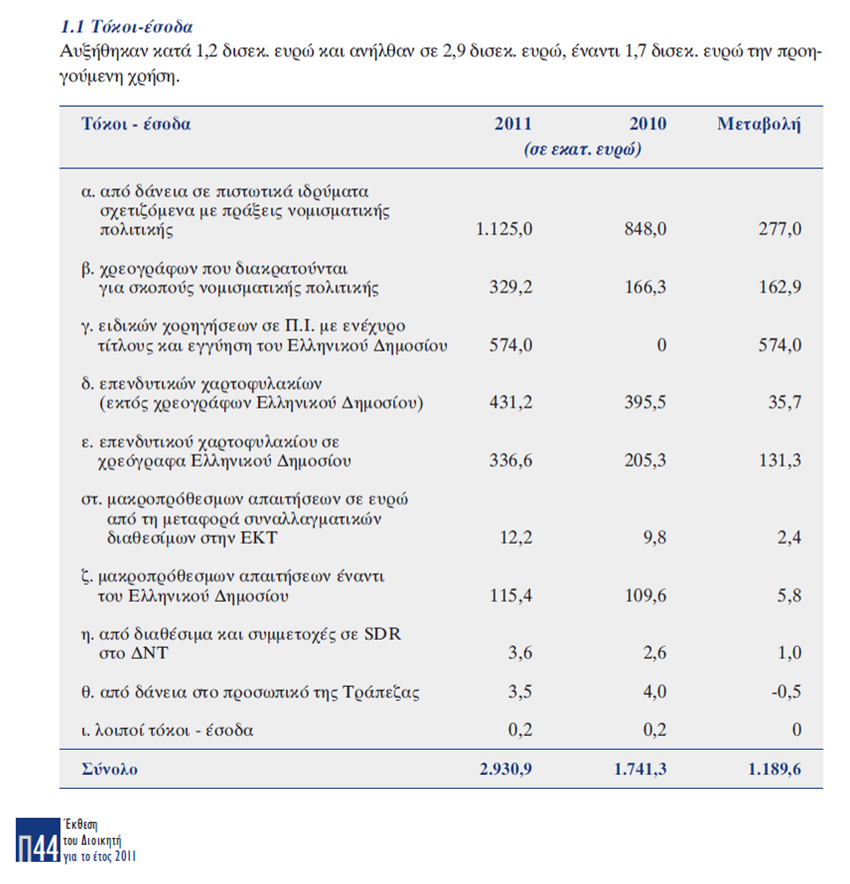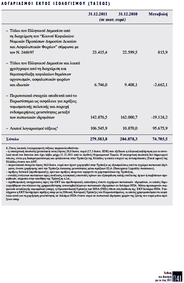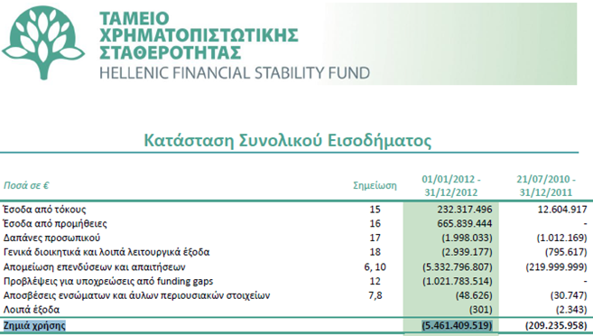 Στην ανωτέρω έκθεση δεν εξηγείται αν και πως εκταμιεύτηκαν από την ανώνυμο εταιρεία «Τράπεζα της Ελλάδος» μέσα στην χρήση του 2011 τα ενενήντα δισεκατομμύρια ευρώ (90.000.000.000,00€), όταν τα τριάντα δισεκατομμύρια ευρώ (30.000.000.000,00€) τα εγγυήθηκε το Ελληνικό Δημόσιο προς την ανώνυμο εταιρεία μήνες αργότερα με τον ν.4056/2012 που δημοσιεύτηκε στο ΦΕΚ 52/Α/12.03.2012.