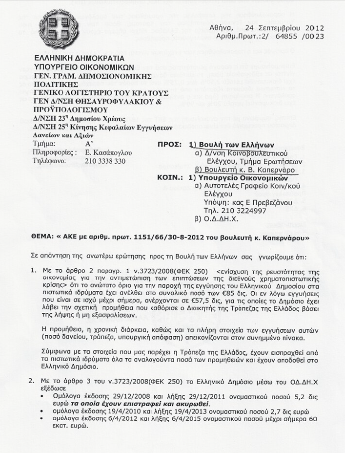 Μέρος των εγγυήσεων του Ελληνικού Δημοσίου που έλαβαν οι τράπεζες έχει ήδη καταπέσει εις βάρος του Ελληνικού Δημοσίου, δηλαδή των Ελλήνων Πολιτών, όπως φαίνεται από την αύξηση του Δημοσίου Χρέους κατά είκοσι τρία δισεκατομμύρια ευρώ διακόσια τριάντα τέσσερα εκατομμύρια εξακόσιες ογδόντα χιλιάδες ευρώ (23.234.680.000,00€) στο δεύτερο τρίμηνο του 2012 όταν αυτό εκτοξεύτηκε από τα διακόσια ογδόντα δισεκατομμύρια διακόσια ενενήντα δύο εκατομμύρια τετρακόσιες σαράντα χιλιάδες ευρώ (280.292.440.000,00€), στα οποία είχε κατέβει από τα τριακόσια εξήντα επτά δισεκατομμύρια εννιακόσια εβδομήντα οκτώ δισεκατομμύρια ευρώ (367.978.000.000,00€) με το «κούρεμα-PSI» το πρώτο τρίμηνο του 2012, στα τριακόσια τρία δισεκατομμύρια πεντακόσια είκοσι επτά εκατομμύρια εκατόν είκοσι χιλιάδες ευρώ (303.527.120.000,00€), όπως εμμέσως αποδέχεται και ο αναπληρωτής Υπ. Οικονομικών Χρήστος Σταικούρας στην απάντηση του (24.09.2012) μετά από την ερώτηση με κατάθεση εγγράφων (αρ. πρωτ. 1151/66/30-8-2012) του Βουλευτή Καπερνάρου. Όπως αποδεικνύεται από την απάντηση το σύνολο των εγγυήσεων σε που ήταν σε ισχύ ανήρχοντο στα 57,5 δισ. € από τα 85 δισ. € για τις οποίες η απάντηση δεν διευκρίνιζε ως όφειλε αν είχαν παρθεί οι εξασφαλίσεις, που οι νόμοι προέβλεπαν από τις τράπεζες, από τον Διοικητή της Τράπεζας της Ελλάδος που ήταν η επιβλέπουσα αρχή. Με βάσει την οικονομική δυσχέρεια των τραπεζών στη δεδομένη χρονική περίοδο (Απρ – Ιουν 2012) εξ αφορμής του PSI και της ανακεφαλαιοποίησης αυτονόητα προκύπτει ότι το δημόσιο χρέος επιβαρύνθηκε από την κατάπτωση των 23.000.000.000,00€ του πρώτου νόμου (3723/2008). Το συμπέρασμα αυτό ενισχύεται και από την απάντηση, ένα χρόνο αργότερα (07.10.2013) στην εκπομπή enikos, του Υπ. Οικονομικών Στουρνάρα όταν σε ερώτηση «αν έχουν καταπέσει οι εγγυήσεις», έδωσε την απάντηση «Από ότι γνωρίζω όχι» (σχετικό link).