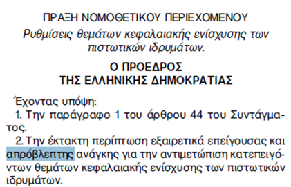 Συνεπώς είναι απολύτως βέβαιο ότι η άμεση ανάγκη αφορούσε το τραπεζικό σύστημα που στο αντίστοιχο διάστημα είχε ρευστοποιήσει εγγυήσεις, της «δήθεν αφερέγγυας Χώρας» σύμφωνα με τους τότε κυβερνώντες την Χώρα αλλά και των Ευρωπαίων αξιωματούχων, συνολικού ύψους 170.000.000.000,00€ πέραν των 23.000.000.000,00€ του ν.3723/2008.