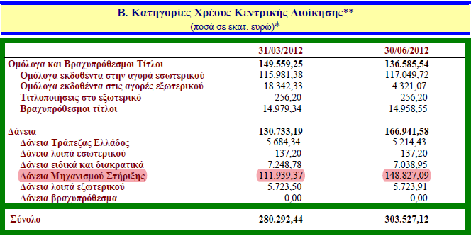 Γεγονός που επιβεβαιώνεται και από τον πίνακα Β (κατηγορίες χρέους Κεντρικής Διοίκησης) του δελτίου δημοσίου χρέους ν.66 (Ιούνιος 2012) αφού εμφανίζεται αύξηση στα δάνεια του μηχανισμού στήριξης από τα εκατόν έντεκα δισεκατομμύρια εννιακόσια τριάντα εννιά εκατομμύρια τριακόσιες εβδομήντα χιλιάδες ευρώ (111.939.370.000,00€) στα εκατόν σαράντα οκτώ δισεκατομμύρια οκτακόσια είκοσι επτά εκατομμύρια ενενήντα χιλιάδες ευρώ (148.827.090.000,00€).