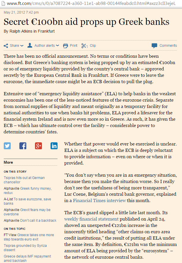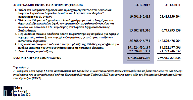 Σημειώνεται ότι στην έκθεση των 244 σελίδων του Διοικητή της «Τράπεζα της Ελλάδας» στην οποία πλέον ασκούν δικαιώματα μετόχου στη Γενική Συνέλευση και μέτοχοι που κατέχουν την υπηκοότητα κράτους μέλους της Ευρωπαϊκής Ένωσης ή του Ευρωπαϊκού Οικονομικού Χώρου δεν γίνεται καμμία αναφορά για το πόσα χρήματα από το πακέτο των ενενήντα δισεκατομμυρίων ευρώ του Ελληνικού Δημοσίου έχει λάβει η κάθε μία από τις ιδιωτικές τράπεζες που συμμετέχουν στο έγκλημα που γίνεται εις βάρος του Ελληνικού Λαού πέραν μιας μοναδικής υποσημείωσης στους λοιπούς λογαριασμούς τάξεως στη σελ. 41 του παραρτήματος της έκθεσης του Διοικητή της κ. Γεωργίου Προβόπουλου για το έτος 2011 που αναφέρει ότι: “περιουσιακά στοιχεία ύψους 84,8 δισεκ. ευρώ που έχουν χορηγηθεί στην Τράπεζα ως εξασφαλίσεις από τα εγχώρια πιστωτικά ιδρύματα, έναντι χορήγησης από την Τράπεζα έκτακτης ρευστότητας μέσω πράξεων ELA (Emergency Liquidity Assistance)”.