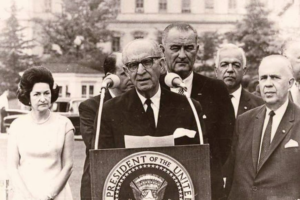 Στο βήμα μπροστά από τον Πρόεδρο των ΗΠΑ, βρίσκεται ο τότε πρωθυπουργός Γεώργιος Παπανδρέου. Δίπλα...