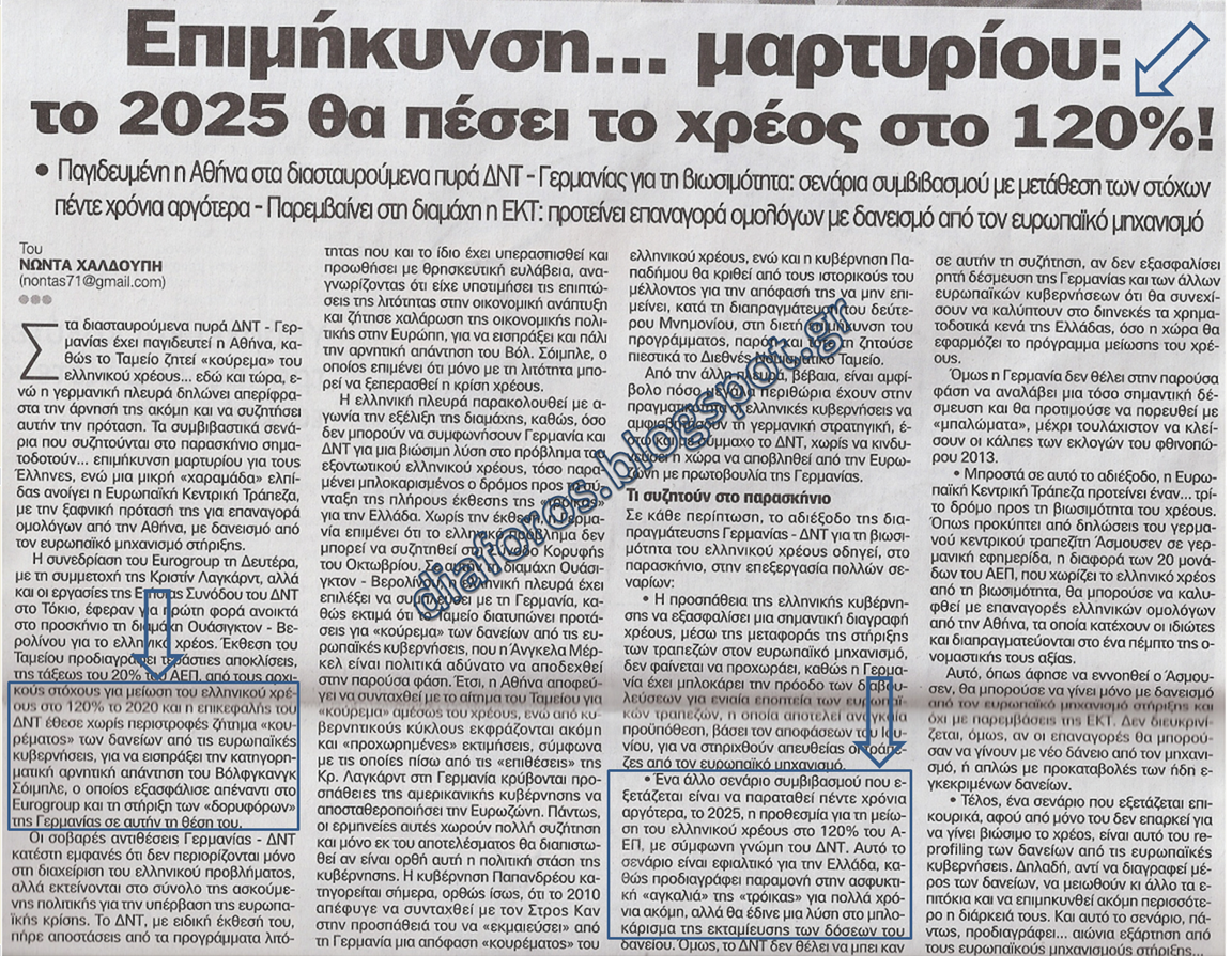 2. Με ποια πρόβλεψη ΑΕΠ (παρανομαστής κλάσματος) υιοθετείται τις απόψεις του ΔΝΤ και της τρόικας που μέχρι τώρα έχουν πέσει σε όλα έξω. Και όχι από άγνοια βέβαια. Γιατί ΔΕΝ έτυχε να δω κάποια πρόβλεψη ΑΕΠ ούτε για το 2020 ούτε για το 2025 στο παρακάτω άρθρο.