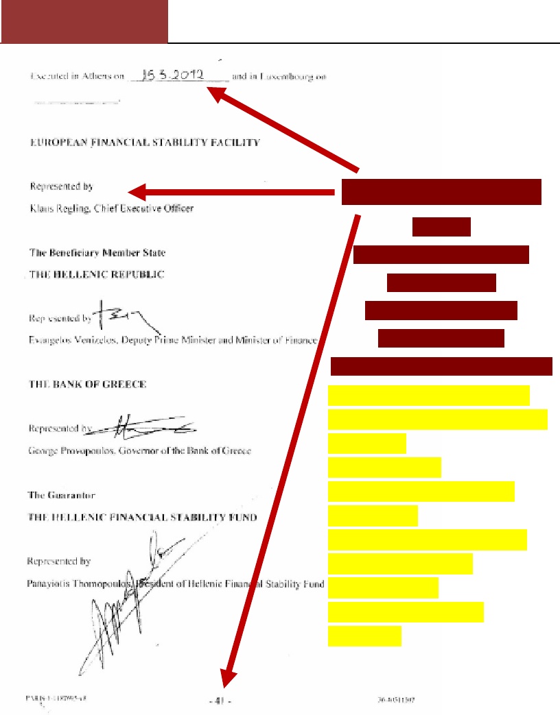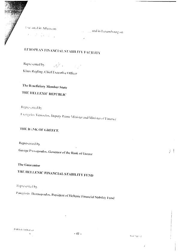 Υπάρχει η σελίδα 41 υπογεγραμμένη ΜΟΝΟ από τους εκπροσώπους της Ελλάδος με ημερομηνία και τόπο «Αθήνα» και η σελίδα 41 υπογεγραμμένη ΜΟΝΟ από τον Klaus Regling με ημερομηνία και τόπο «Λουξεμβούργο».