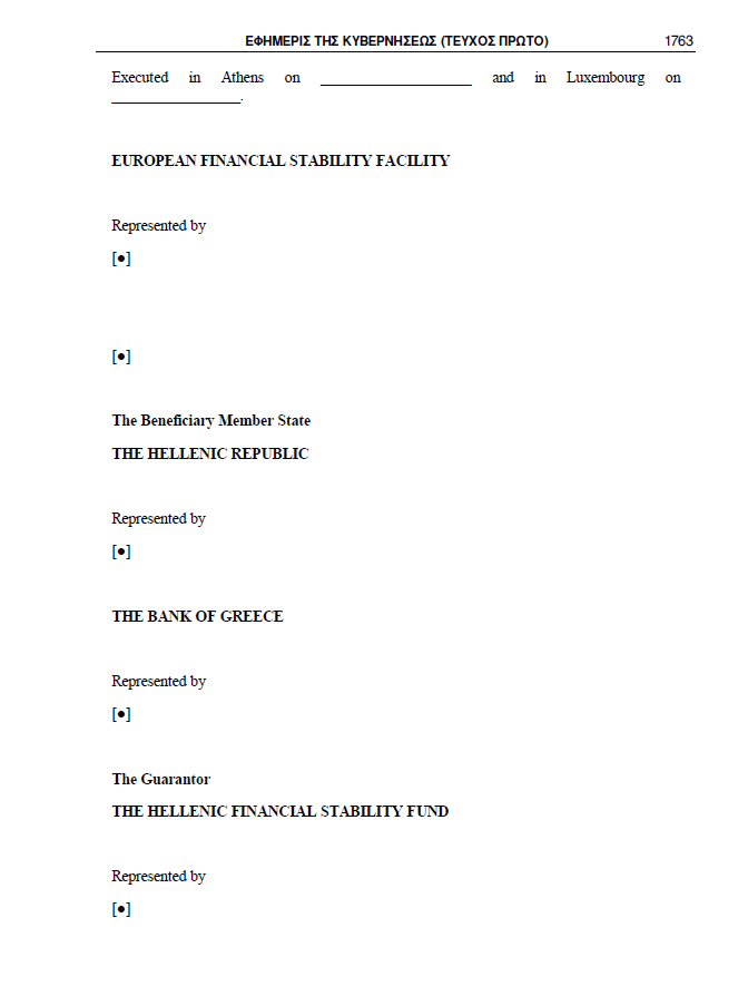 1. Η Ελλάδα έχει στα χέρια της ένα αντίγραφο της σύμβασης χωρίς την υπογραφή του EFSF και δεσμεύτηκε με σχέδιο συμβάσεως, όχι με πραγματική σύμβαση.