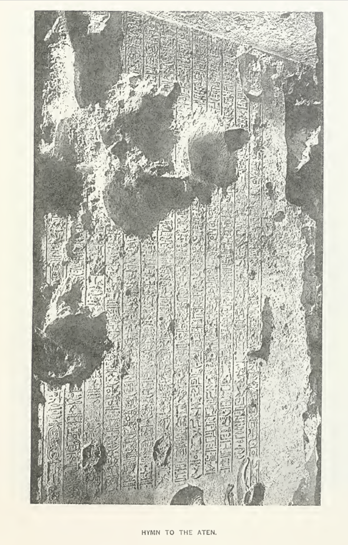 This is the “long hymn” to the Aton, from the tomb of Eye at Tell el-Amarna. Akh-en-Aton’s reign was about 1380 to 1362 B.C. The best copy of the text is that of N. de G. Davies, The Roci^ Tombs of El Amarna, vi (London, 1908), PI. xxvu. Translations will be found in Erman, LAE, 288-91, and in J. H. Breasted, The Dawn of Conscience (New York, 1933), 281-86 *