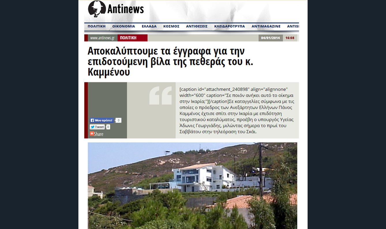 αφού η αρχική ανάρτηση του Antinews “Αποκαλύπτουμε τα έγγραφα για την επιδοτούμενη βίλα της πεθεράς του κ. Καμμένου” κατέβηκε για “ανεξήγητους” λόγους …